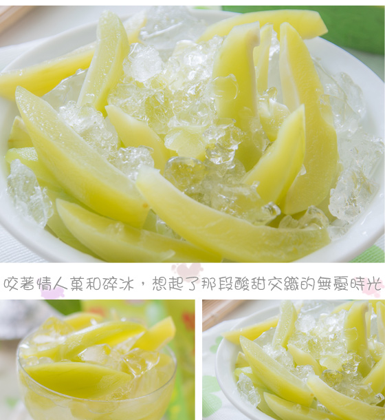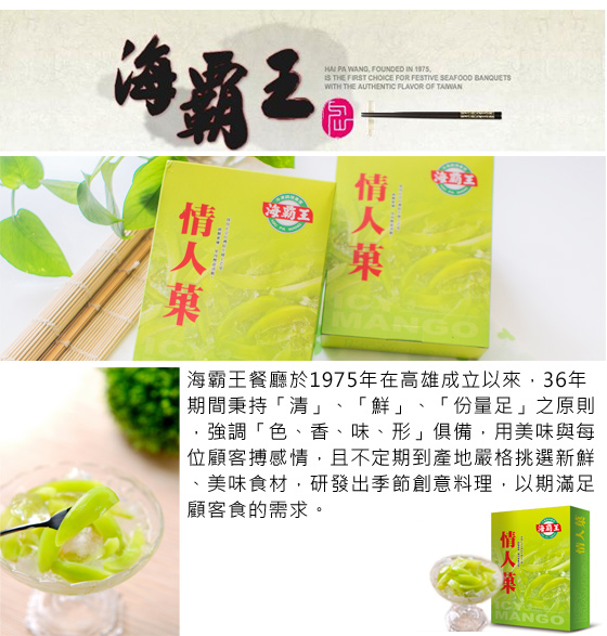 【海霸王】超人氣夏日限定情人果冰(300g/盒) 知名美食餐廳,美味凍漲推薦到【海霸王】吃飯,絕對不會錯過的最後一道甜點…現在,可以用俗擱大碗的實惠價格,讓您在盛夏裡就像又遇見了另一段戀曲般,感受酸甜交織的難忘滋味… ![]() 初戀般好滋味!清爽迷人!嚴選屏東三地門新鮮芒果青,果肉肥厚、口感清脆,傳統獨特的手藝,加純糖蜜煉,不含人工添加物,清涼微酸的口感,如情人般「酸在嘴裡,甜在心裡」。 ![]() 清脆口感,清涼微酸,一陣陣酸甜回憶湧上心頭,讓情人菓帶給你美好滋味。 ![]() 滿滿的情人菓和碎冰,吃起來好過癮,酸酸甜甜的滋味讓您瞬間透心涼,在悠閒的午後,彷彿又回到那段倆小無猜的初戀時光。 品名:【海霸王】超人氣夏日限定情人果冰 內容物成份:青仔芒果、蔗糖、鹽、開水 每份營養成份:依產品包裝所示 內容量:300g/盒(固型體約75g) 產地:台灣 有效期限:18個月 ※因製作/包裝過程繁複,實品規格可能會有些許誤差 ※為保持產品最佳風味,開封後請盡速食用完畢 ※商品圖檔顏色因電腦螢幕設定差異會略有不同,以實際商品顏色為準 |