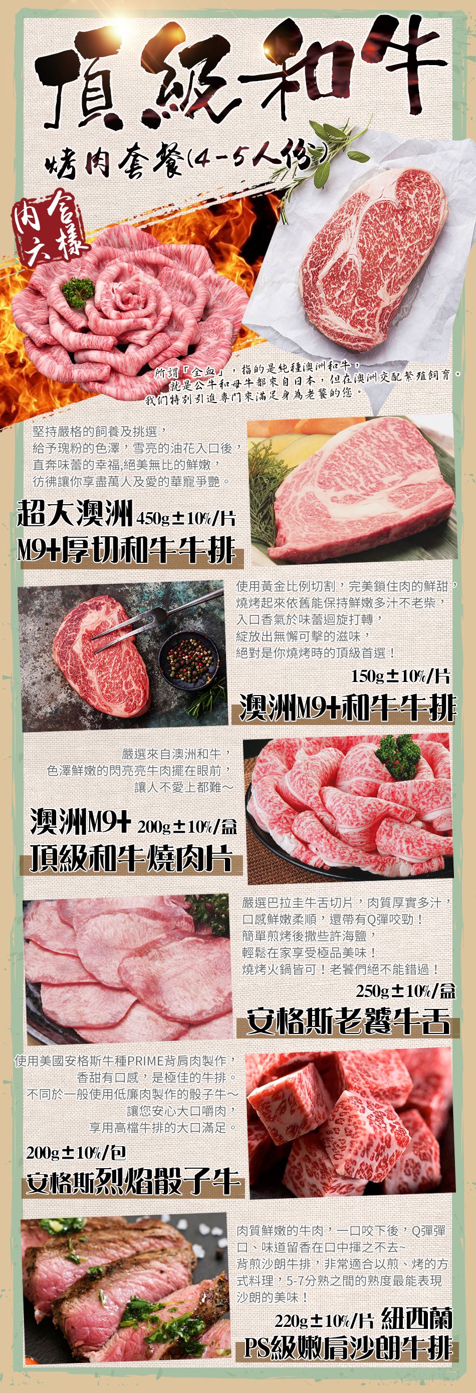 頂級【和牛】烤肉套餐(4-5人份) 超大澳洲M9+厚切和牛牛排 450G±10% /片 澳洲M9+頂級和牛燒肉片 200G±10%/份 澳洲M9+和牛牛排 150G±10%/份 安格斯烈焰骰子牛 200g±10% / 包 安格斯老饕牛舌 250G±10%/盒 紐西蘭PS級嫩肩莎朗牛排 220g±10%/片