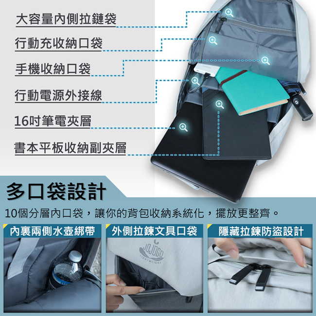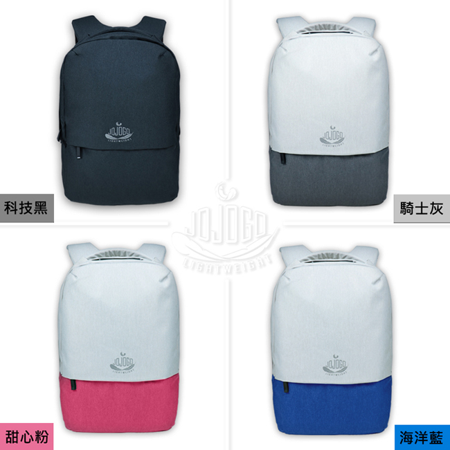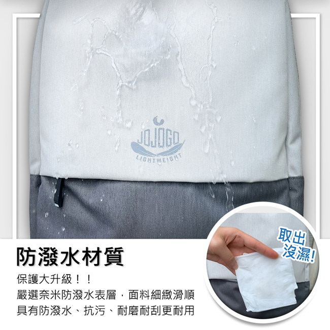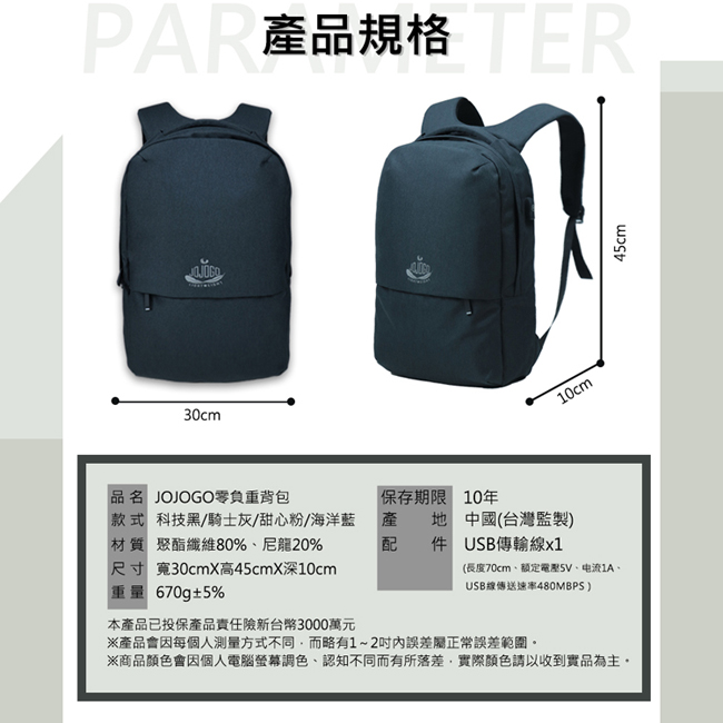 品名: JOJOGO零負重背包 款式: 科技黑/騎士灰/甜心粉/海洋藍 材質: 聚酯纖維80%、尼龍20% 尺寸: 寬30cmX高45cmX深10cm 重量: 670g±5% 配件: USB傳輸線x1(長度70cm,額定電壓5V,电流1A,USB線傳送速率480MBPS ) 保存期限: 10年 產地: 中國(台灣監製) 注意事項 1.第一次使用建議先打開通風,可去除新品餘味。 2.請勿靠近高溫、火源及潮濕處。 3.請勿放入尖銳物品避免造成損壞。 4.使用後請用濕布擦拭,並存放於陰涼處晾乾。 5.請勿直接放入洗衣機清洗,本產品不適合熨燙、烘乾及乾洗。 本產品已投保產品責任險新台幣3000萬元 ※產品會因每個人測量方式不同,而略有1~2吋內誤差屬正常誤差範圍。